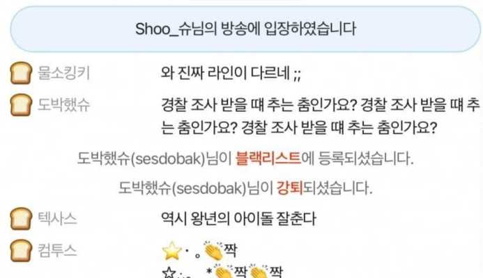 더불어 인터넷 BJ 특성 상, 생방송 중 바로바로 후원을 받을 수 있다는 점을 꼬집으며, 그녀의 방송을 불편해하는 시청자들이 여럿 보였는데요, 심지어 '도박했슈'라는 닉네임으로 접속한 한 시청자는 방송에서 춤을 추는 슈를 보고, '경찰 조사 받을 때 추는 춤인가요?'라는 댓글을 달아 차단당하기도 했습니다.