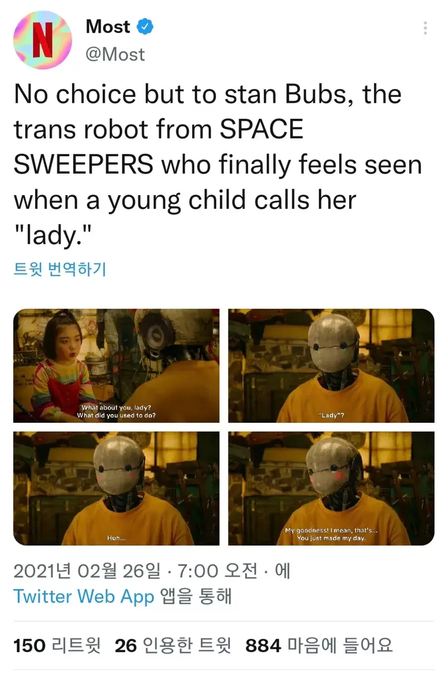 영화 승리호에 등장한 로봇은 영화배우 유해진이 목소리 연기를 한 것으로도 유명한데요, 우리나라에서는 이렇다할 신선한 요소가 없는 이 로봇에 대해서도 외국에서는 신선하다고 평가하고 있습니다. 그 이유는 보통 로봇이 등장하는 영화에서는, 애초에 로봇의 '성별'에 대해 의문을 제기하지 않기 때문입니다. 아이의 시선으로 바라본 로봇에 대한 궁금증이 영화에 반영된 것이 한 몫 한 것 같습니다.